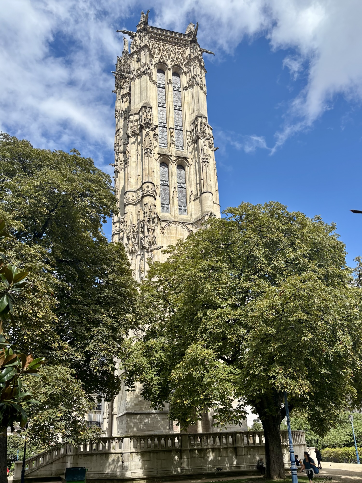 Les nuages s’effilochent et le soleil en profite. Moi aussi, j’en profite, pour sécher. Je repasse, bien sûr, par la Tour Saint Jacques de la Boucherie, le point de départ officiel du Chemin de Tours.