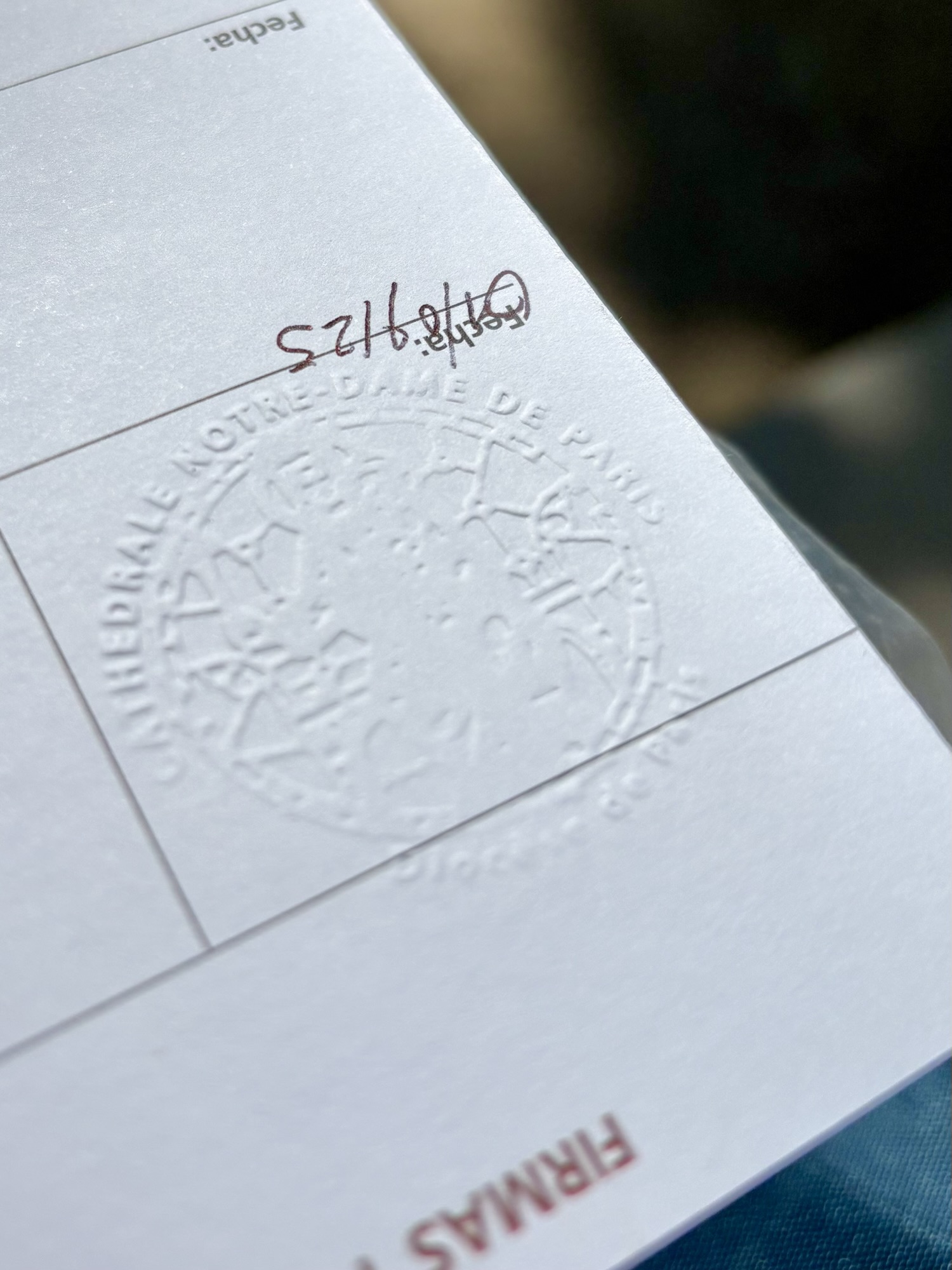 Et j’ai le tampon de la cathédrale sur ma credentiale. Enfin, ce n’est pas un cachet classique, c’est une pince à gaufrer qui a laissé une empreinte en relief. Classe mais pas très visible.