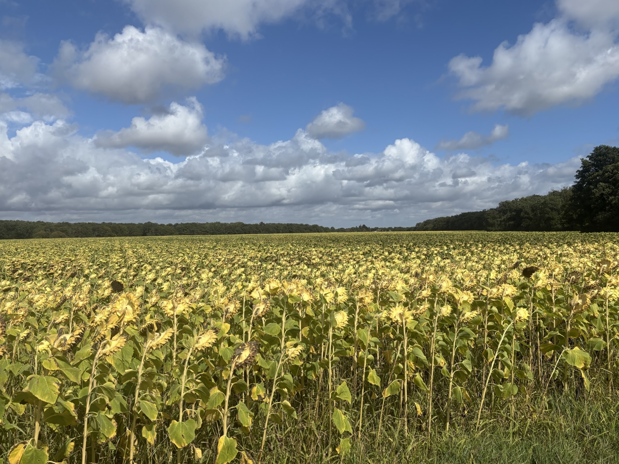Nous traversons de vastes champs de tournesols… qui en cette saison ont bien fini de suivre la course du soleil.