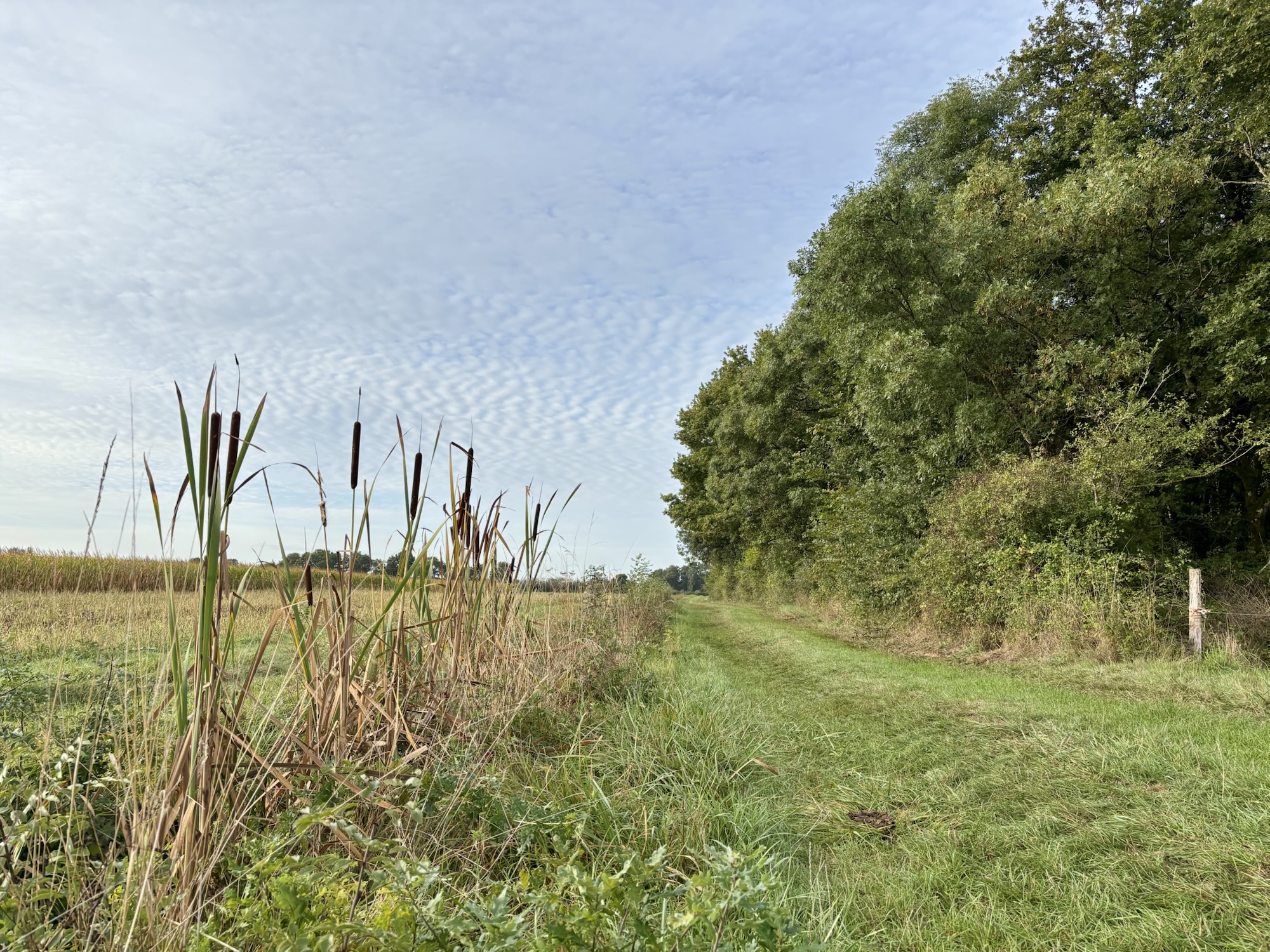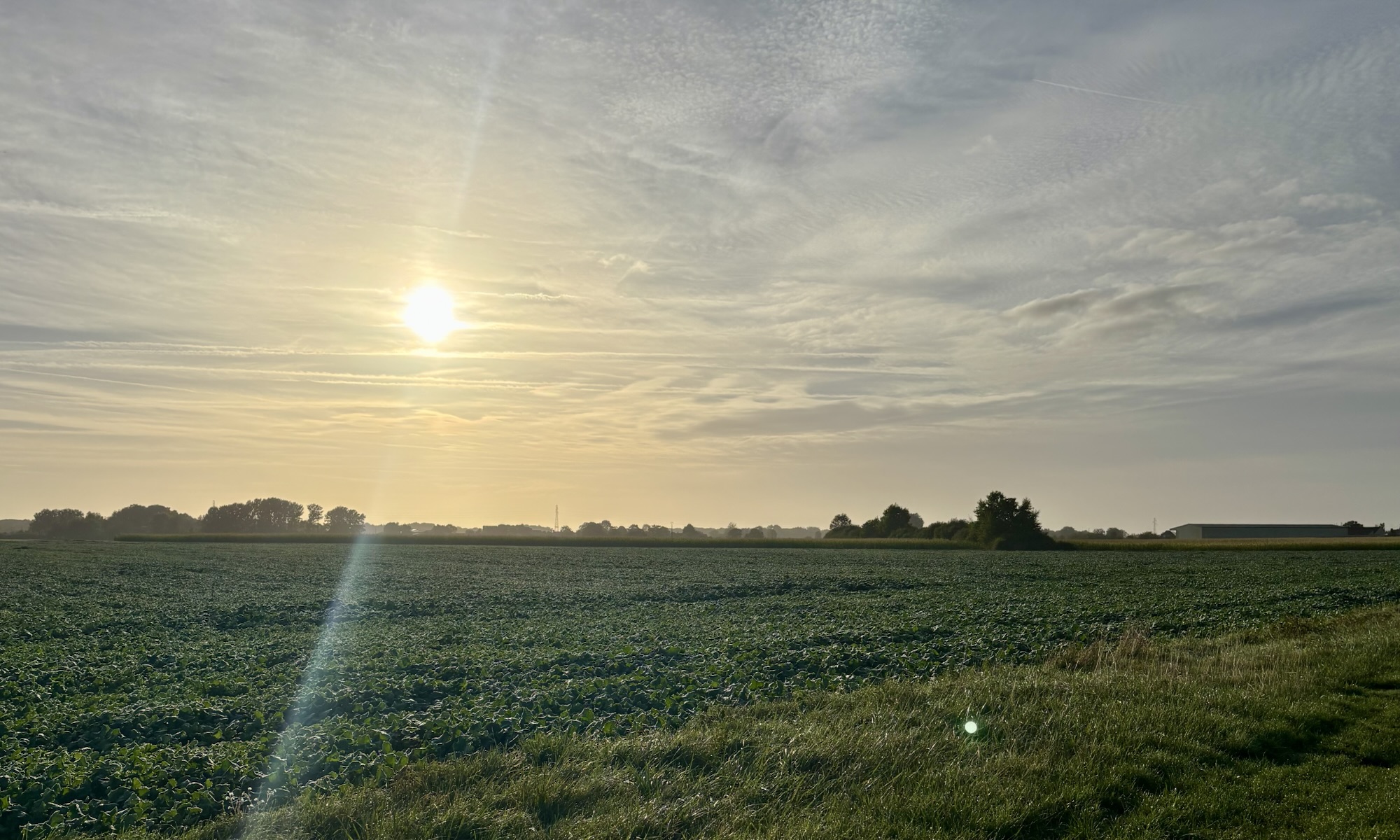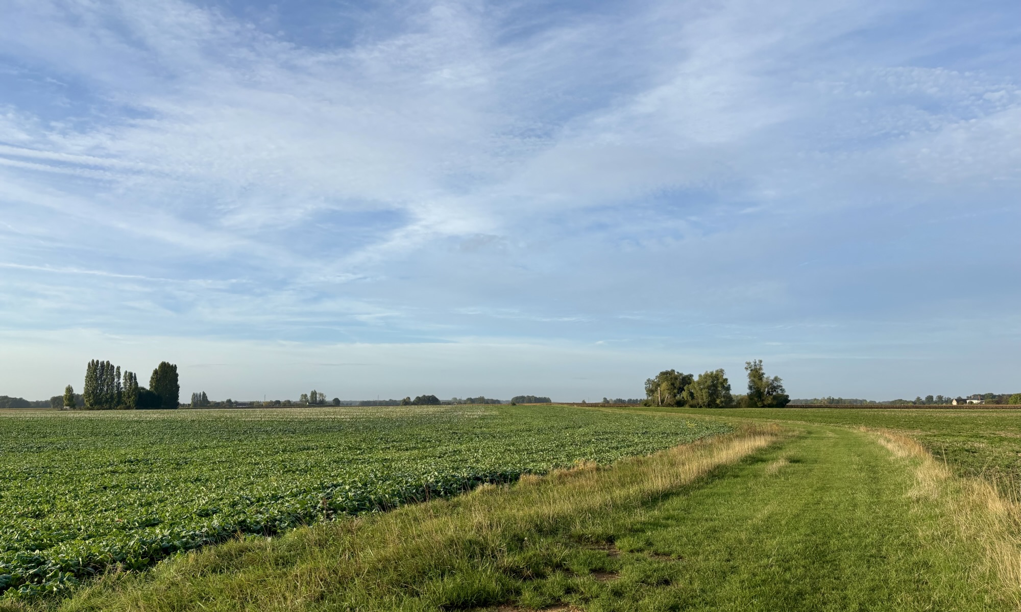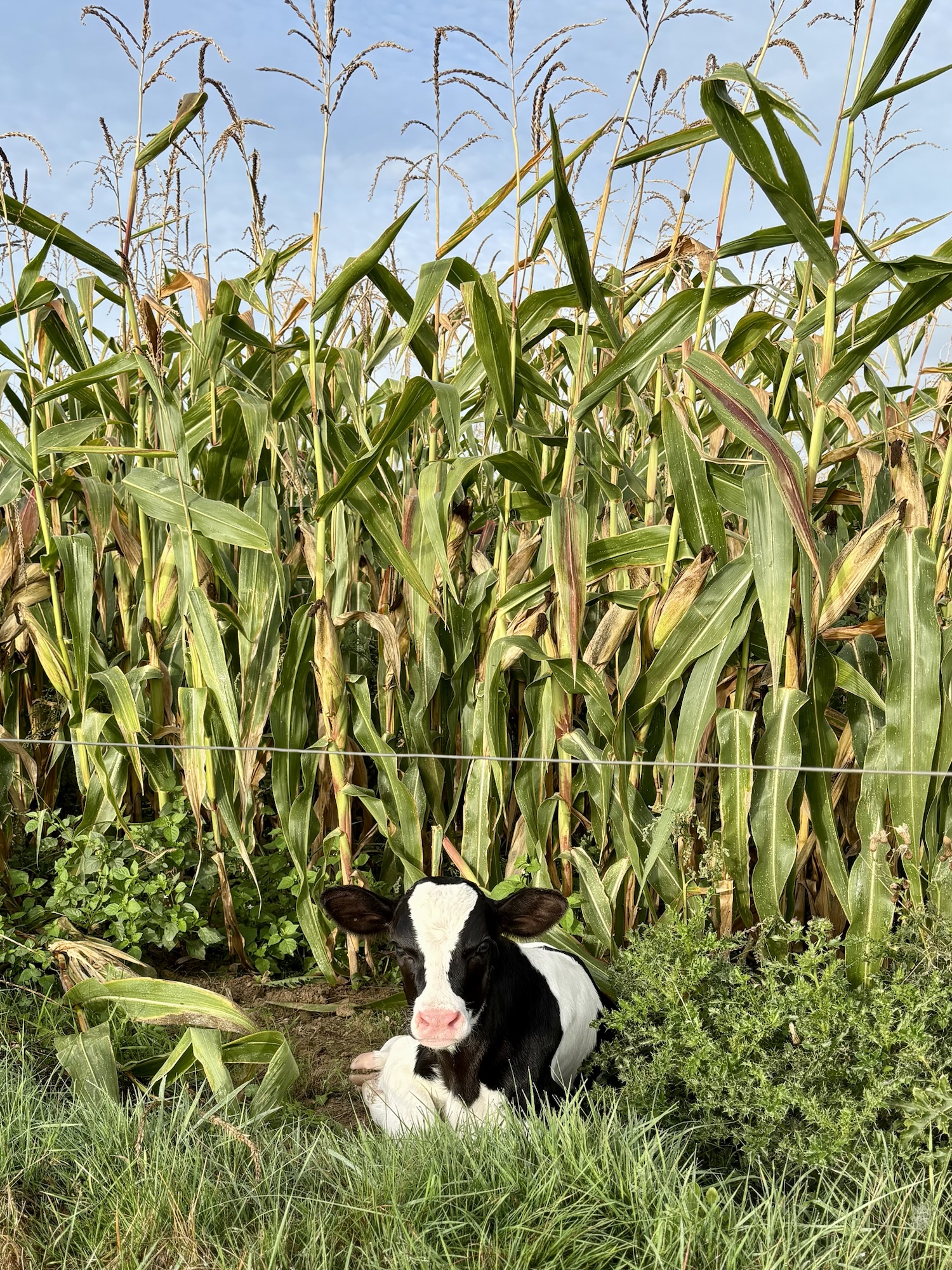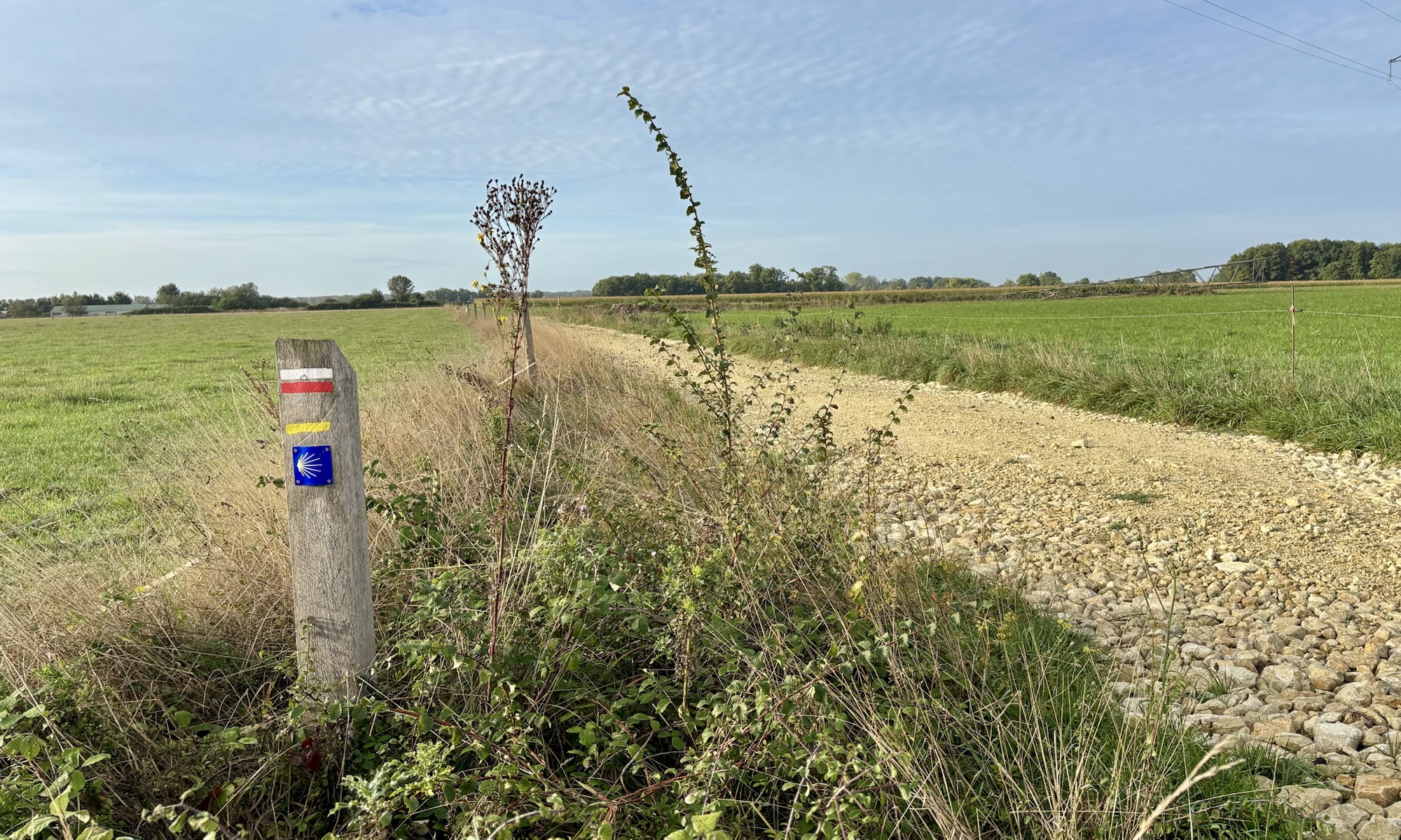 Après une de ces étapes qui marquent un chemin, je me lance au petit matin dans une campagne toute verte et humide de rosée. Une centaine idée du bonheur! Je me sens en forme, même si je n’ai pas été dormir avec les poules.Soudain, mon regard est attiré par une forme blanche à ma droite. Un tout jeune veau se repose au pied d’un champ de maïs. Un moment, je me demande si je dois prévenir quelqu’un. Mais je me rends compte que plus loin dans la prairie à ma gauche, se trouve un troupeau de vaches. J’imagine que sa meuh-man en fait partie et qu’il s’arrangera bien pour faire le trajet inverse lorsqu’il aura faim. Ah, on l’a retrouvé! Décidément, on est un peu négligent dans la région. Égarer un veau passe encore, mais qui peut bien paumer une ville !