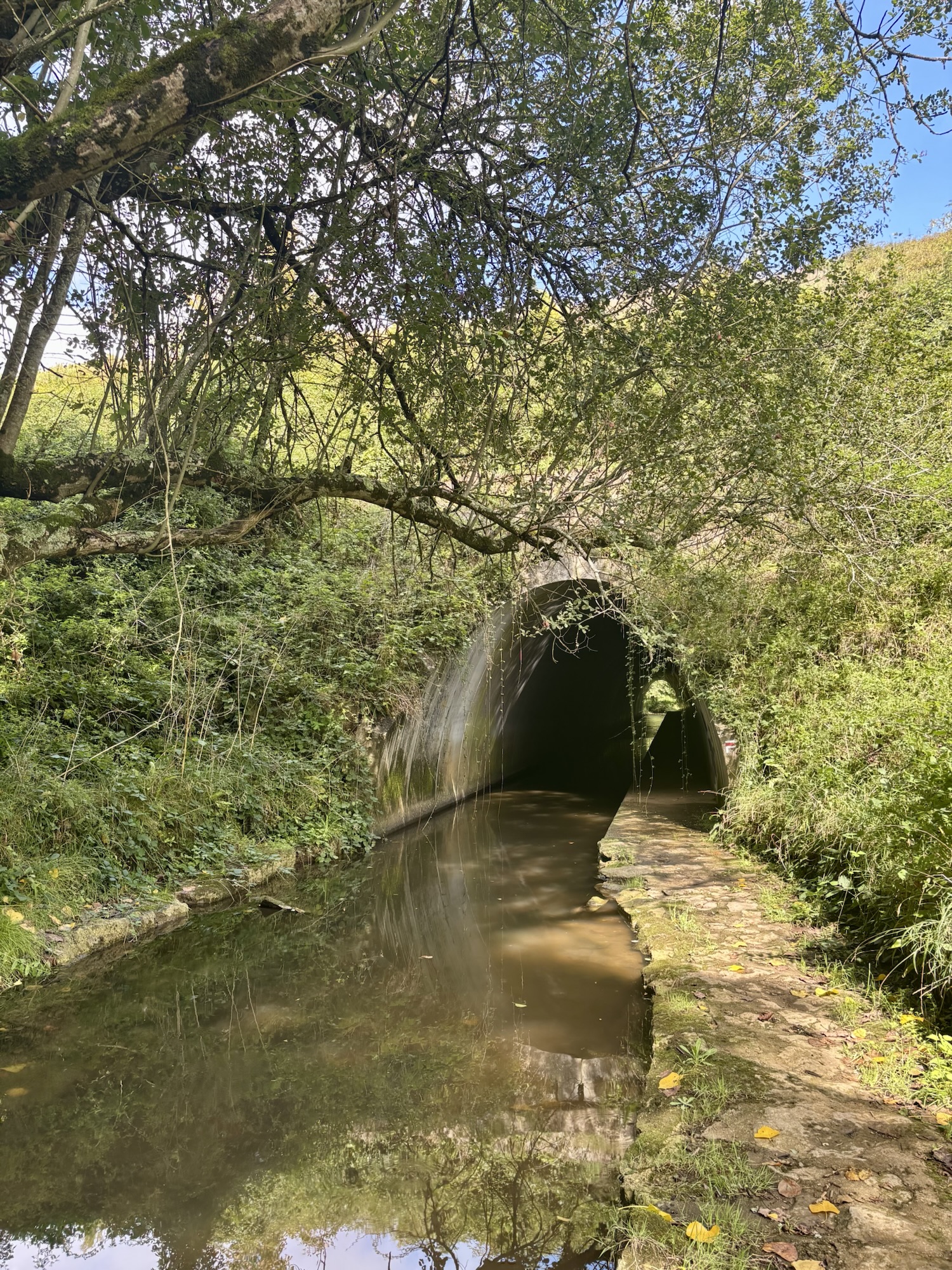 Le début du trajet de l’après-midi se passe sur un genre de Ravel. Mais brutalement il me faut faire un quart de tour à droite et descendre au fond d’un vallon ? C’est parce que le tracé nous fait passer sous la départementale 948 par un tunnel en compagnie de la Beronne.