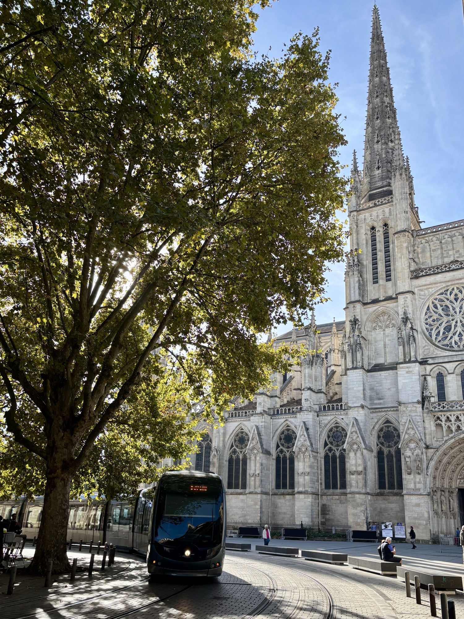 Les clous me font maintenant passer les portes de la ville pour y suivre un tracé jacquaire, forcément religieux. J’arrive devant la très vaste et très gothique, cathédrale Saint-André. Remarquez au passage le tram, aux allures de cyclope, son coup de cloche résonne partout dans la ville. C’est ici qu’ont été célébrés des mariages qui ont marqué l’histoire européenne. D’abord celui d’Alienor d’Aquitaine avec Louis VII, dont la dissolution a été à l’origine de la guerre des Cent Ans. Ensuite celui de Louis XIII et de l’Infante d’Espagne Anne d’Autriche, 14 ans tous les deux. En parallèle s’y est tenu celui de leurs frère et soeur, Philippe II d’Espagne avec la princesse Élisabeth de France.