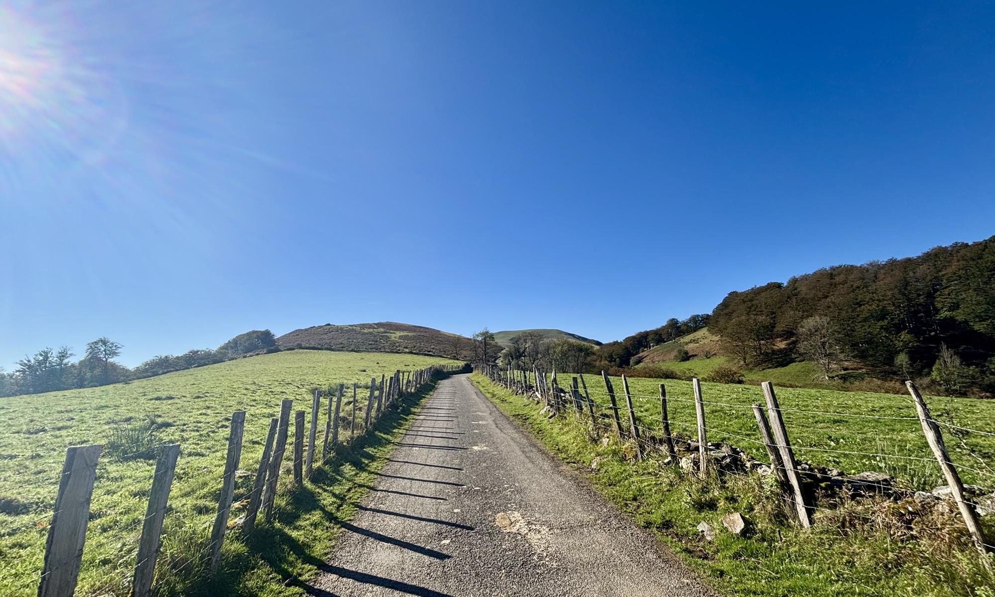 Et oui, j’ai décidé aujourd’hui de m’offrir une étape bonus. Il va faire beau, je suis en forme, j’ai encore envie de continuer ce chemin, alors pourquoi pas.Saint-Jean-Pied-de-Port est encore enseveli sous les nuages quand je passe la porte d’Espagne. Il est pourtant bien passé neuf heures et je dois donc être un des derniers pèlerin à quitter la ville.Ici, on ne compte plus le nombre de gîte accueillant les pèlerins, sans parler des hôtels et des dizaines de maisons d’hôtes. Il faut dire que que cette ville rassemble non seulement les pèlerins empruntant trois des grands chemins français, le Puy, Tours et Vezelay, mais aussi les marcheurs arrivant de deux autres importantes voies, celle du Piémont Pyrénéen le GR 10, qui relie la Méditerranée à l’océan Atlantique en passant par les cols des Pyrénées. Et à tous ces randonneurs il faut encore ajouter tous les autres qui ont décidé de commencer ici leur camino car l’étape que je vais parcourir est la première du Camino Frances. La ville annonce héberger de 60 000 pèlerins par an. Encore un peu embrumé au départ, le Camino emprunte la route Napoléon et monte assez gentiment.