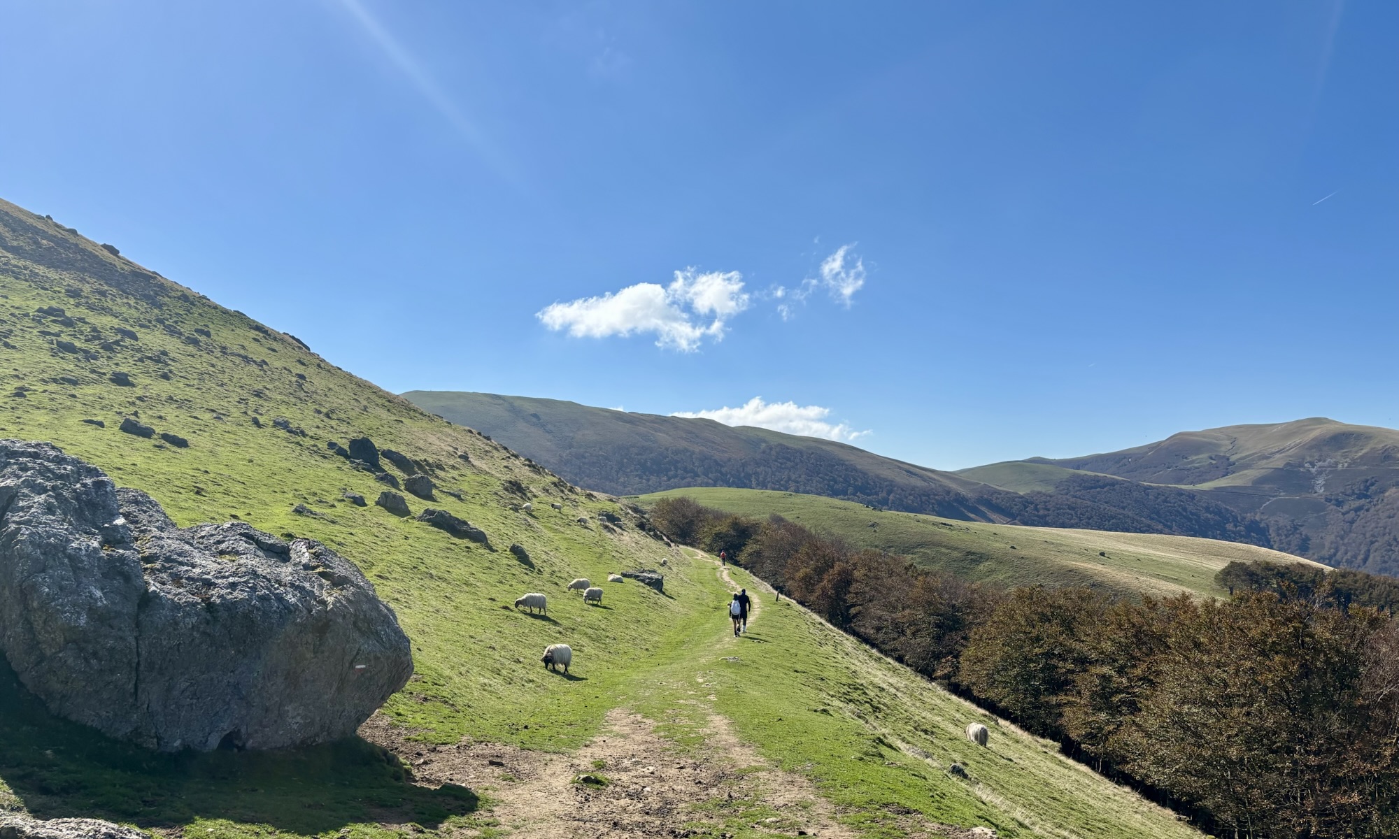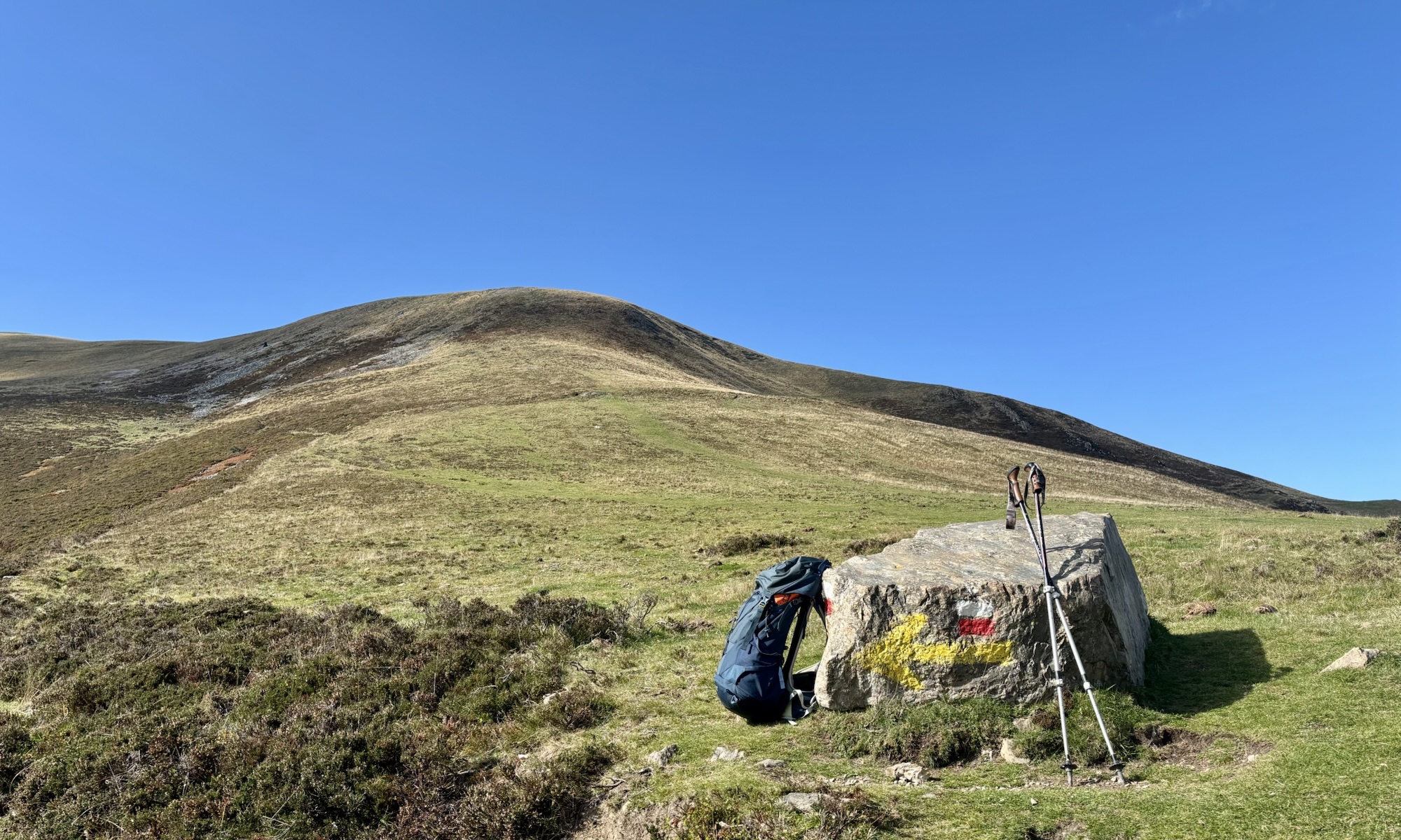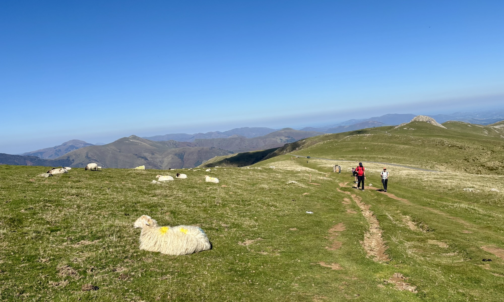 Après une demi-heure, je suis passé au-dessus des nuages. Et je peux commencer à profiter des panoramas. 10h30 enfin nous quittons la route. J’ai dit nous parce que j’ai déjà rattrapé une douzaine de pèlerins. Mais nous retrouvons le bitume avant le refuge d’Orisson. Nous avons gravi 8 km, des dizaines de pèlerins s’y sont arrêtés pour s’y désaltérer, certains passeront la nuit ici.
