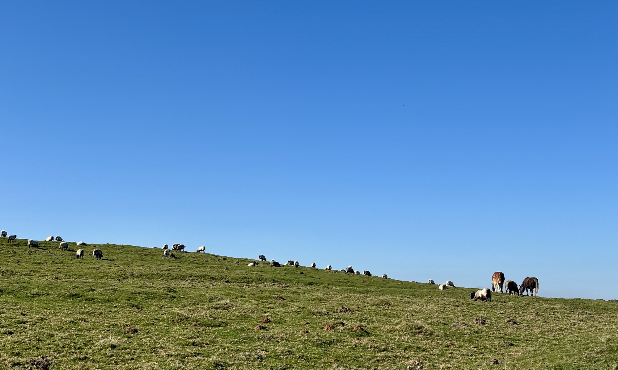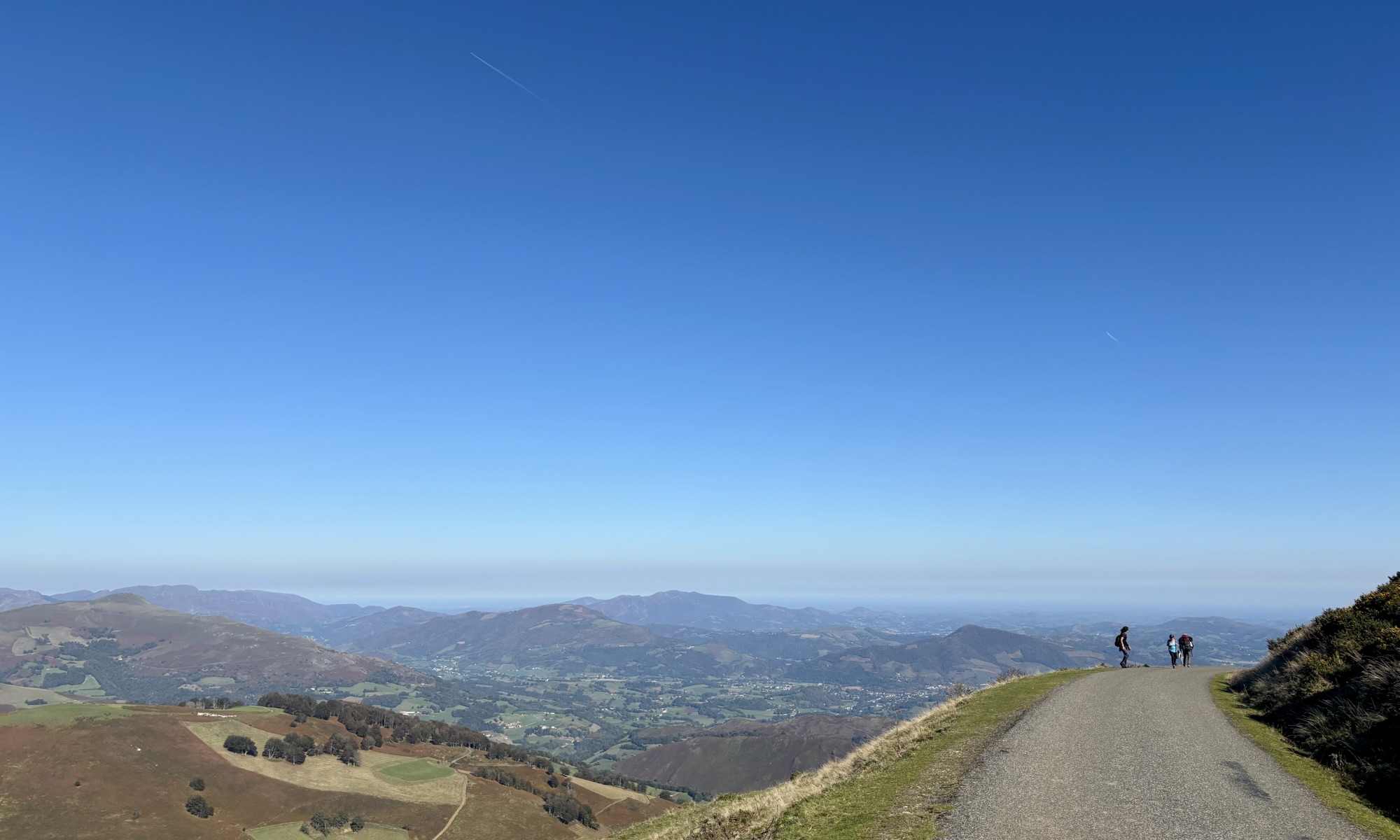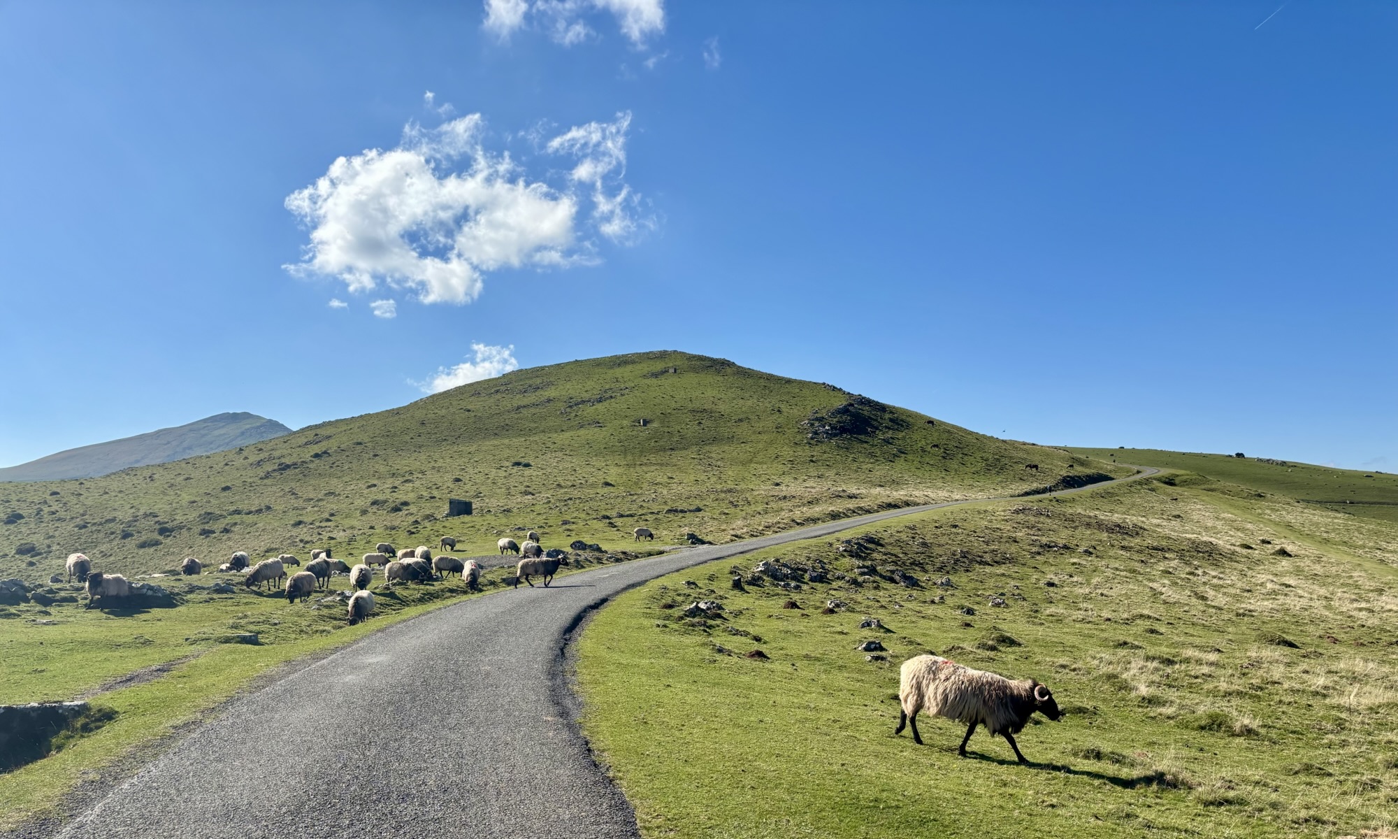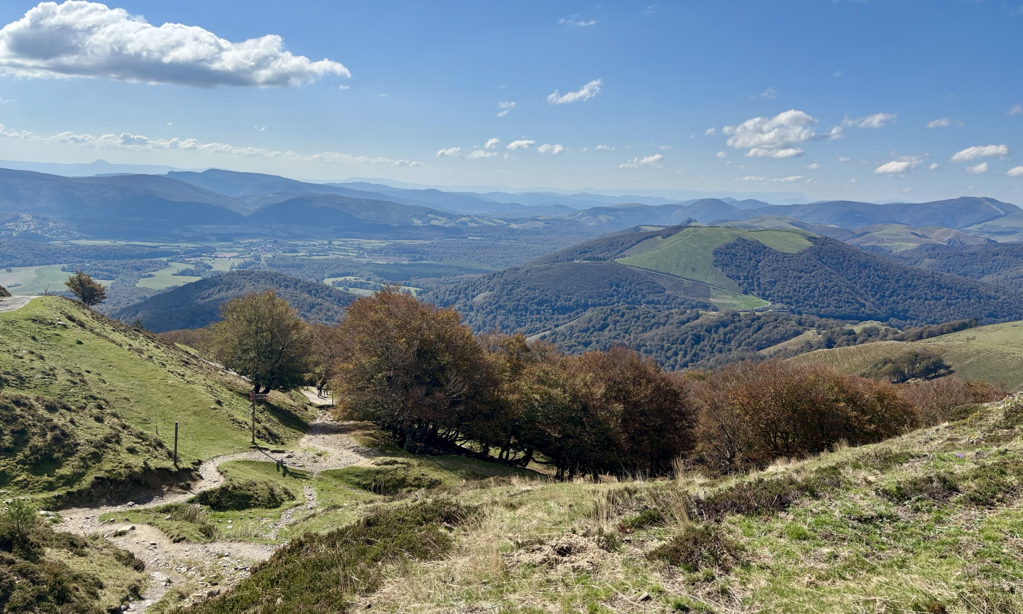 Après une demi-heure, je suis passé au-dessus des nuages. Et je peux commencer à profiter des panoramas. 10h30 enfin nous quittons la route. J’ai dit nous parce que j’ai déjà rattrapé une douzaine de pèlerins. Mais nous retrouvons le bitume avant le refuge d’Orisson. Nous avons gravi 8 km, des dizaines de pèlerins s’y sont arrêtés pour s’y désaltérer, certains passeront la nuit ici.