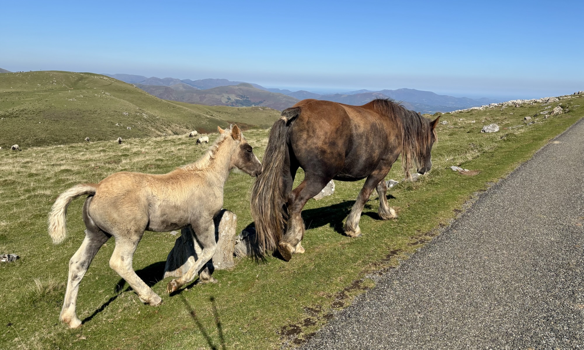 Les troupeaux de moutons se succèdent, et de nombreux chevaux semi-sauvages paissent avec eux. Il y a presque autant de poulains que de chevaux adultes. Ce sont des chevaux de Mérens, une race typique des Pyrénées. Une camionnette « street food » ravitaille des marcheurs. J’en ai rattrapé maintenant un grand nombre.