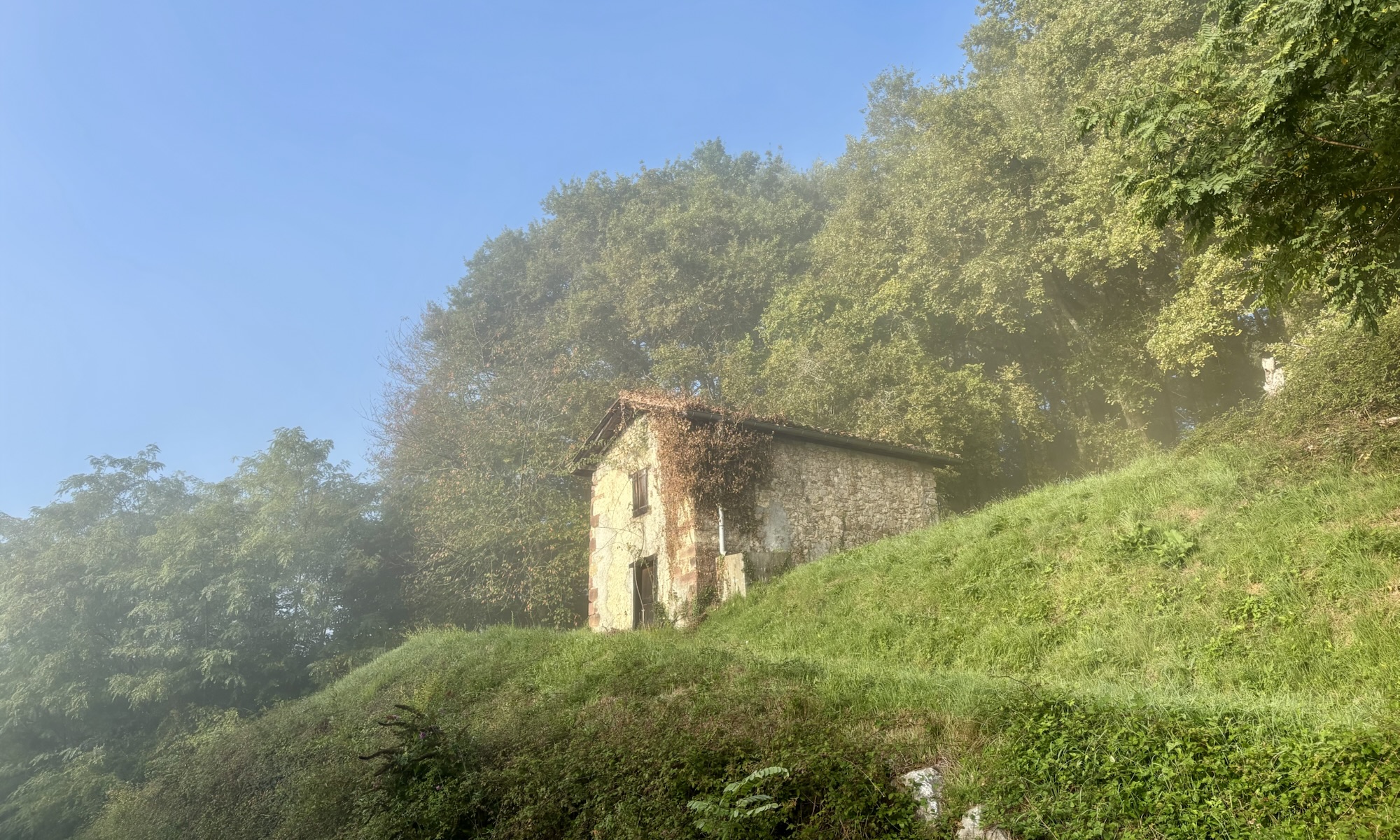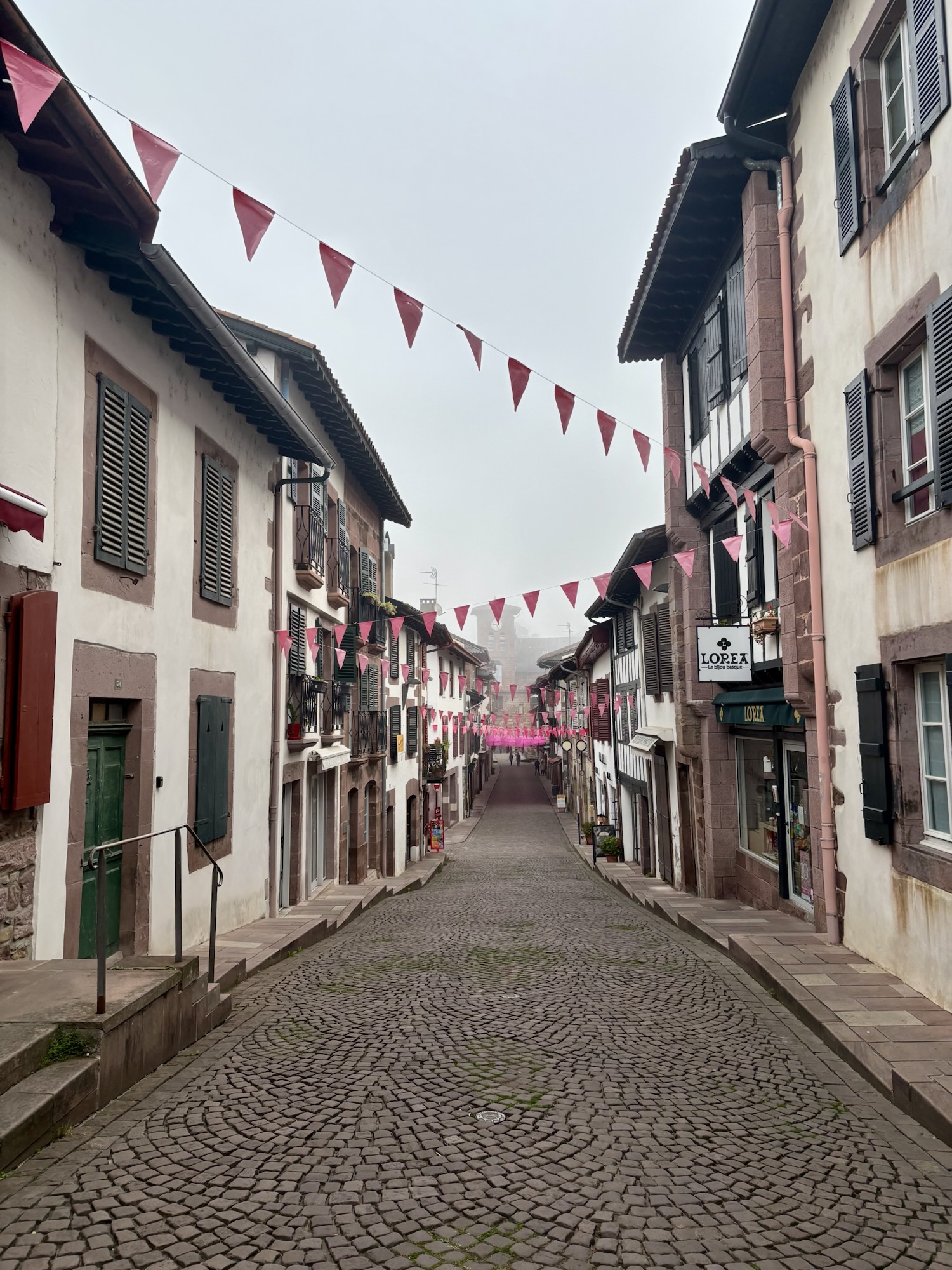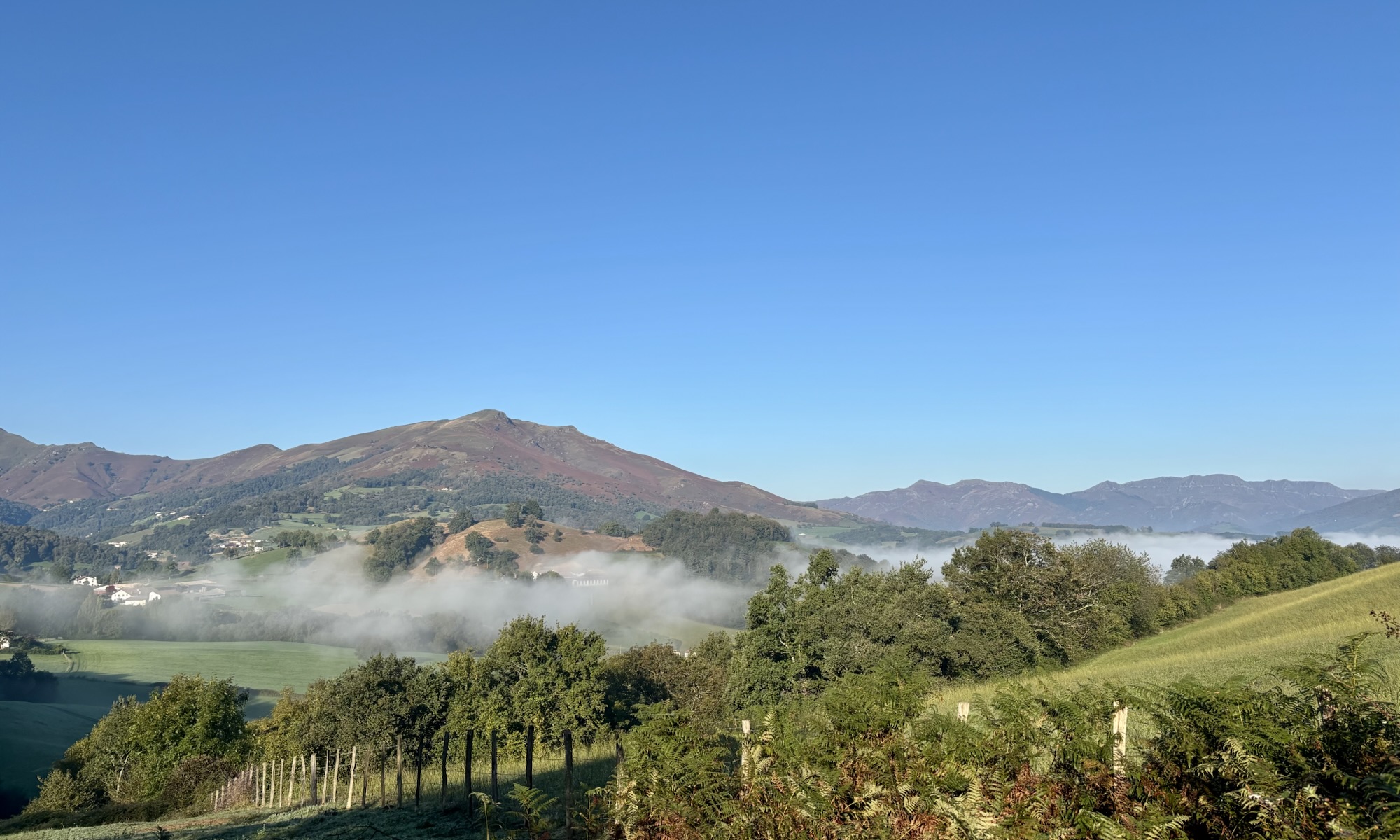 Et oui, j’ai décidé aujourd’hui de m’offrir une étape bonus. Il va faire beau, je suis en forme, j’ai encore envie de continuer ce chemin, alors pourquoi pas.Saint-Jean-Pied-de-Port est encore enseveli sous les nuages quand je passe la porte d’Espagne. Il est pourtant bien passé neuf heures et je dois donc être un des derniers pèlerin à quitter la ville.Ici, on ne compte plus le nombre de gîte accueillant les pèlerins, sans parler des hôtels et des dizaines de maisons d’hôtes. Il faut dire que que cette ville rassemble non seulement les pèlerins empruntant trois des grands chemins français, le Puy, Tours et Vezelay, mais aussi les marcheurs arrivant de deux autres importantes voies, celle du Piémont Pyrénéen le GR 10, qui relie la Méditerranée à l’océan Atlantique en passant par les cols des Pyrénées. Et à tous ces randonneurs il faut encore ajouter tous les autres qui ont décidé de commencer ici leur camino car l’étape que je vais parcourir est la première du Camino Frances. La ville annonce héberger de 60 000 pèlerins par an. Encore un peu embrumé au départ, le Camino emprunte la route Napoléon et monte assez gentiment.
