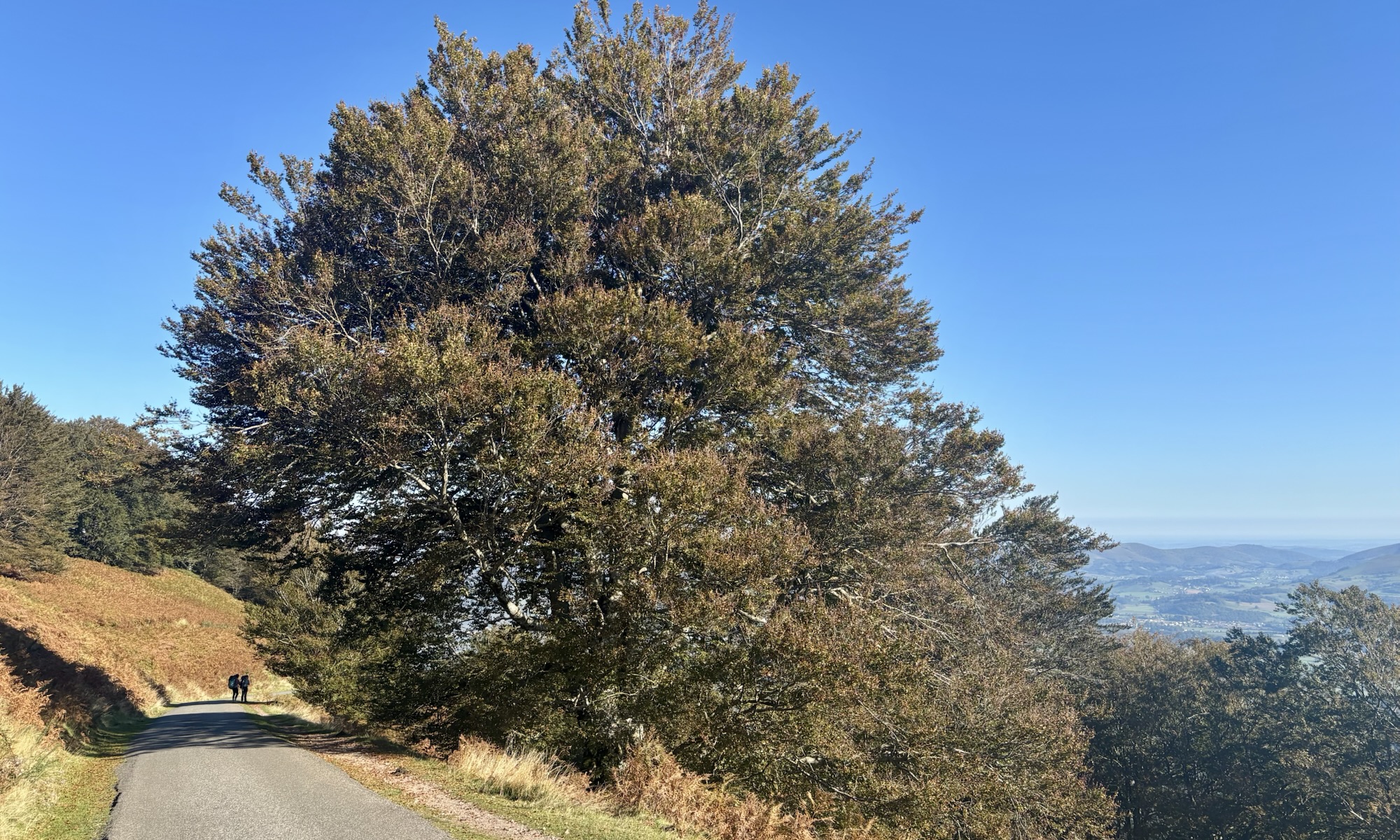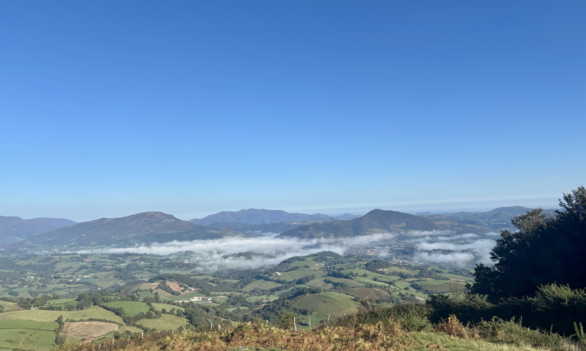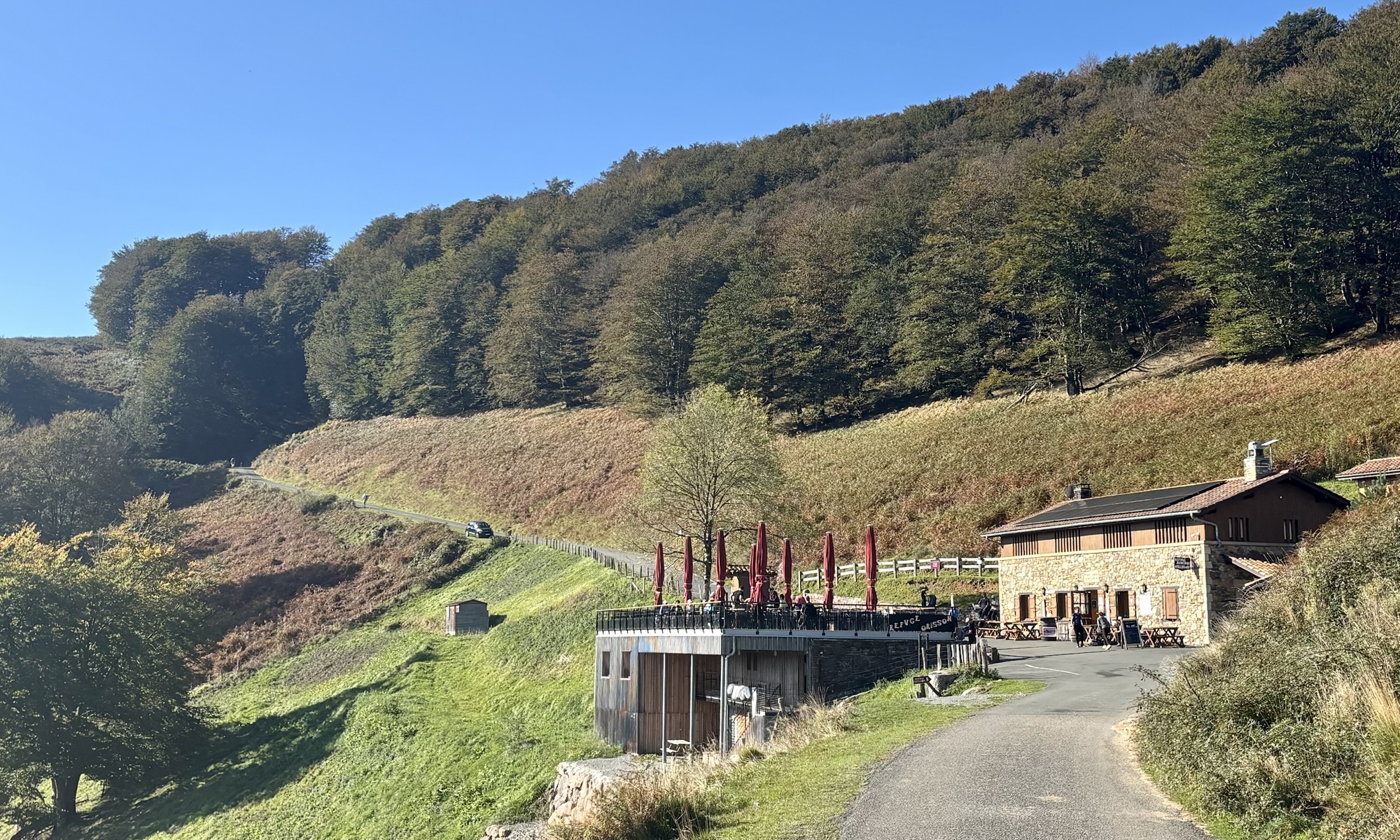 Après une demi-heure, je suis passé au-dessus des nuages. Et je peux commencer à profiter des panoramas. 10h30 enfin nous quittons la route. J’ai dit nous parce que j’ai déjà rattrapé une douzaine de pèlerins. Mais nous retrouvons le bitume avant le refuge d’Orisson. Nous avons gravi 8 km, des dizaines de pèlerins s’y sont arrêtés pour s’y désaltérer, certains passeront la nuit ici.