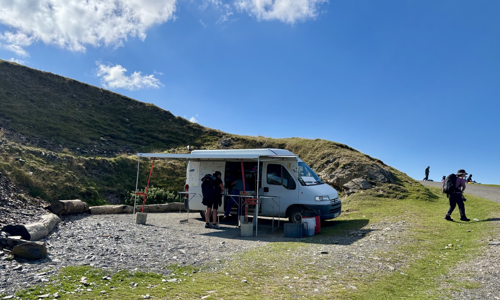 Les troupeaux de moutons se succèdent, et de nombreux chevaux semi-sauvages paissent avec eux. Il y a presque autant de poulains que de chevaux adultes. Ce sont des chevaux de Mérens, une race typique des Pyrénées. Une camionnette « street food » ravitaille des marcheurs. J’en ai rattrapé maintenant un grand nombre.